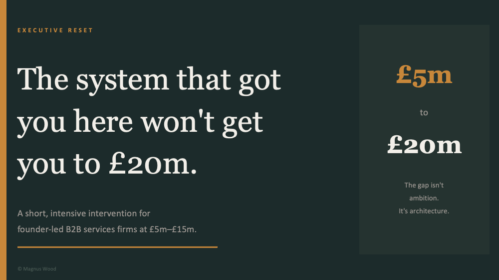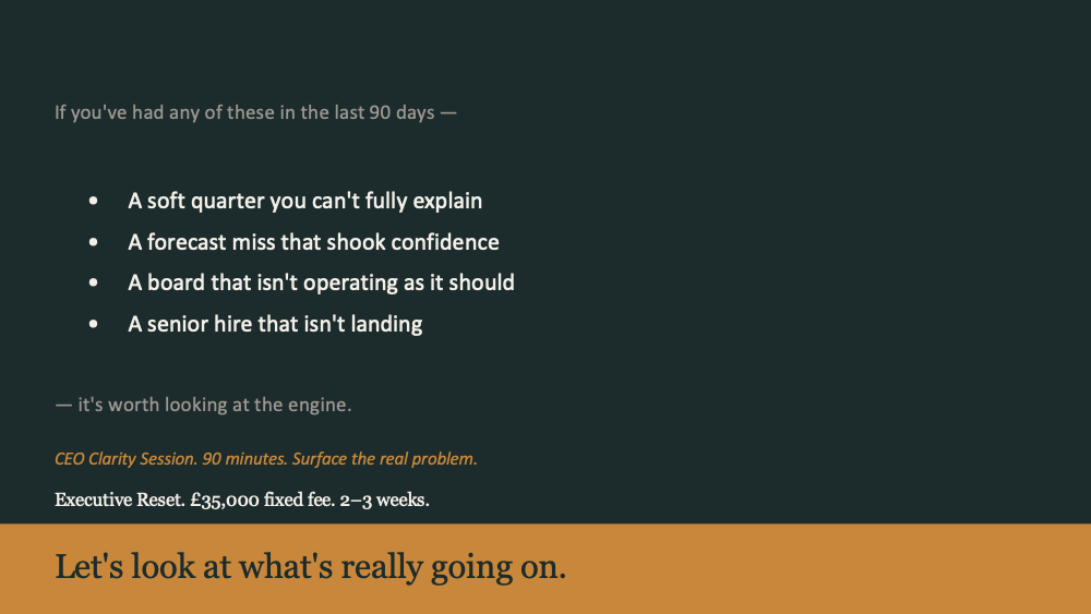 The slides below set out how I think about the problem, the four-layer diagnostic, and the Executive Reset in full.