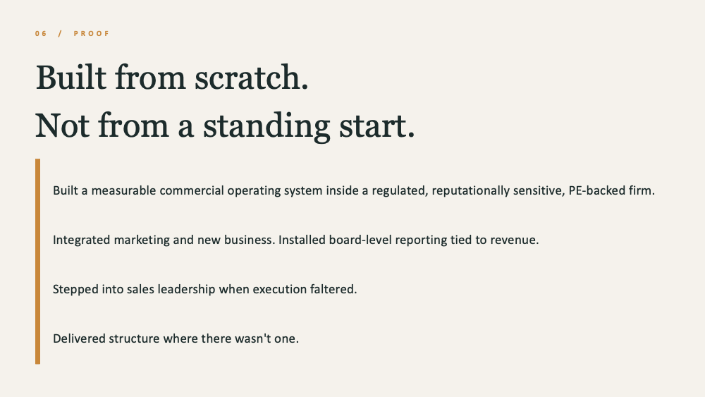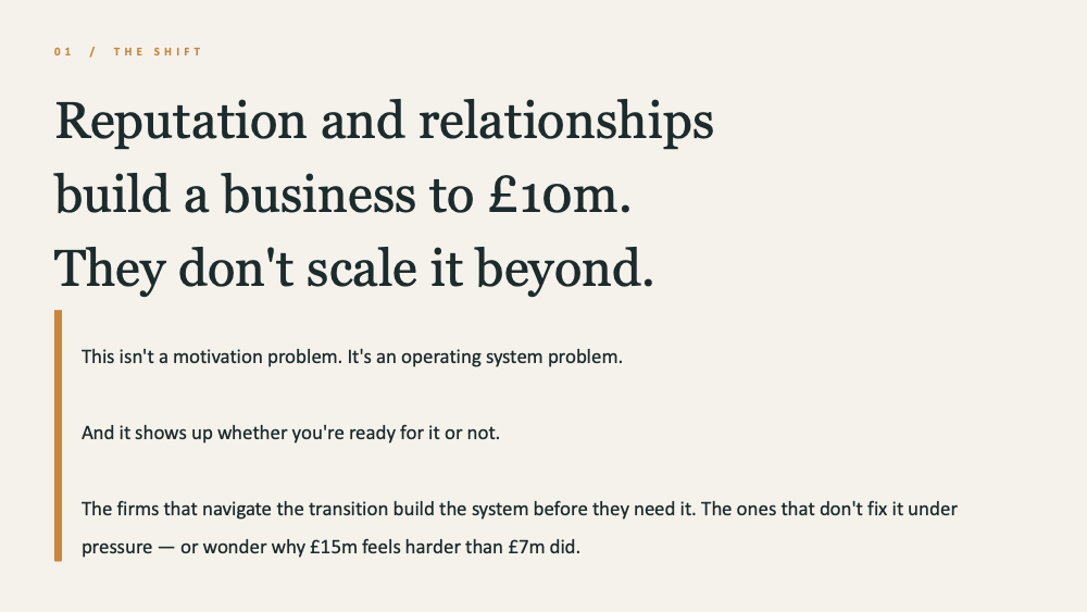 Typically at £5m–£15m revenue, where growth pressure is real and the commercial system is starting to strain.