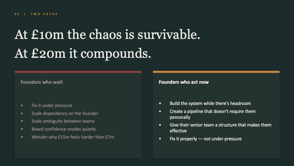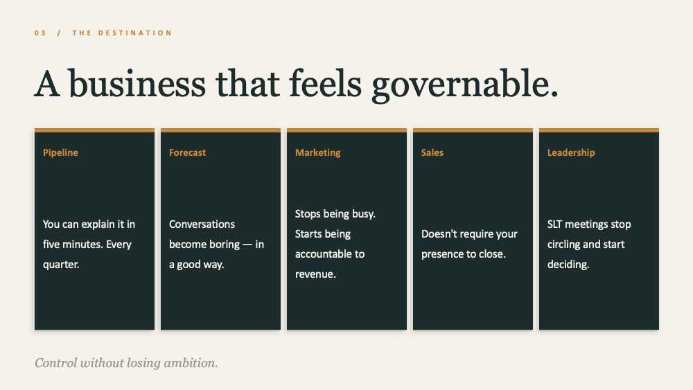The pipeline begins to wobble. Targets stretch. Sales and marketing stay active but alignment becomes less certain. Board conversations carry more tension than they should. The founder is still too central to revenue.