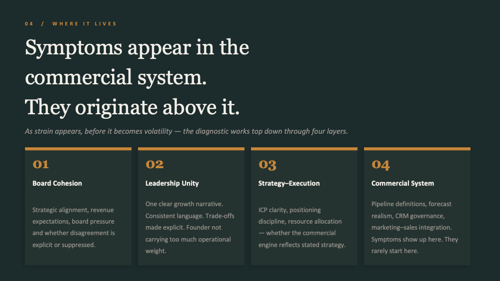 I assess four layers, in order: board cohesion and strategic alignment, executive narrative and leadership unity, strategy-to-execution coherence, and commercial system integrity. Symptoms show up in the commercial system. They rarely originate there.