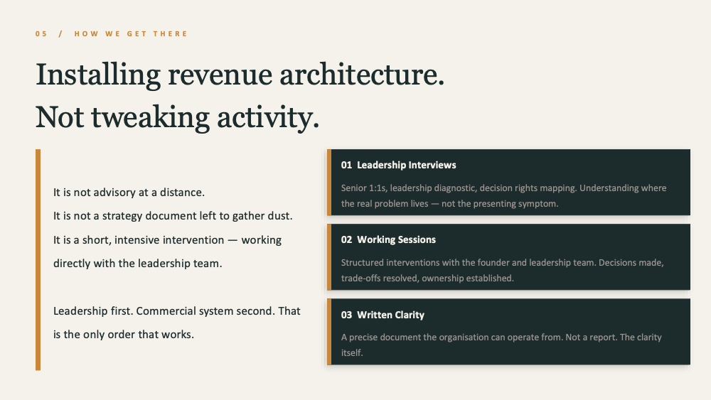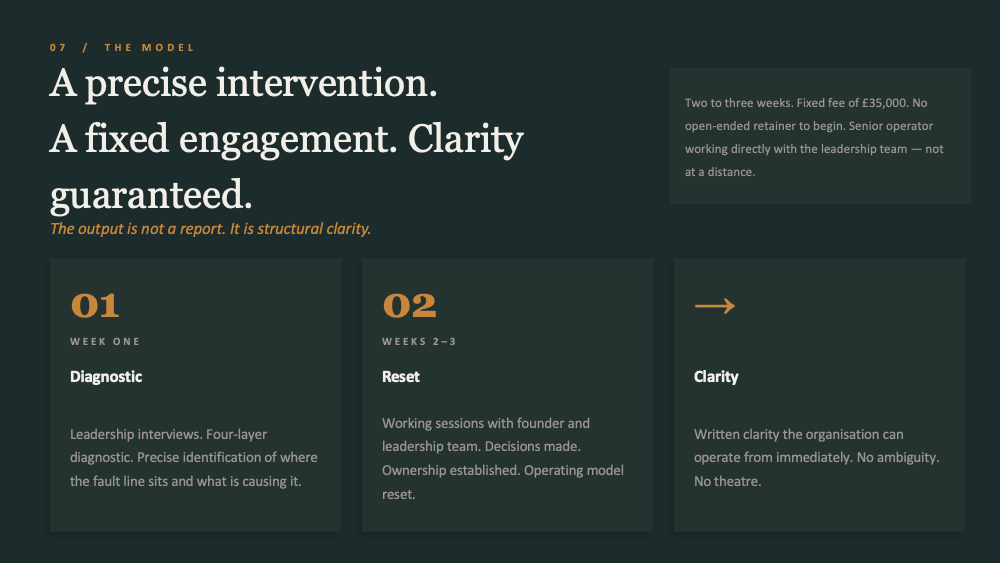 Includes leadership interviews, working sessions with the founder and leadership team, a structural diagnosis, clear decisions and ownership, and written clarity the organisation can operate from.